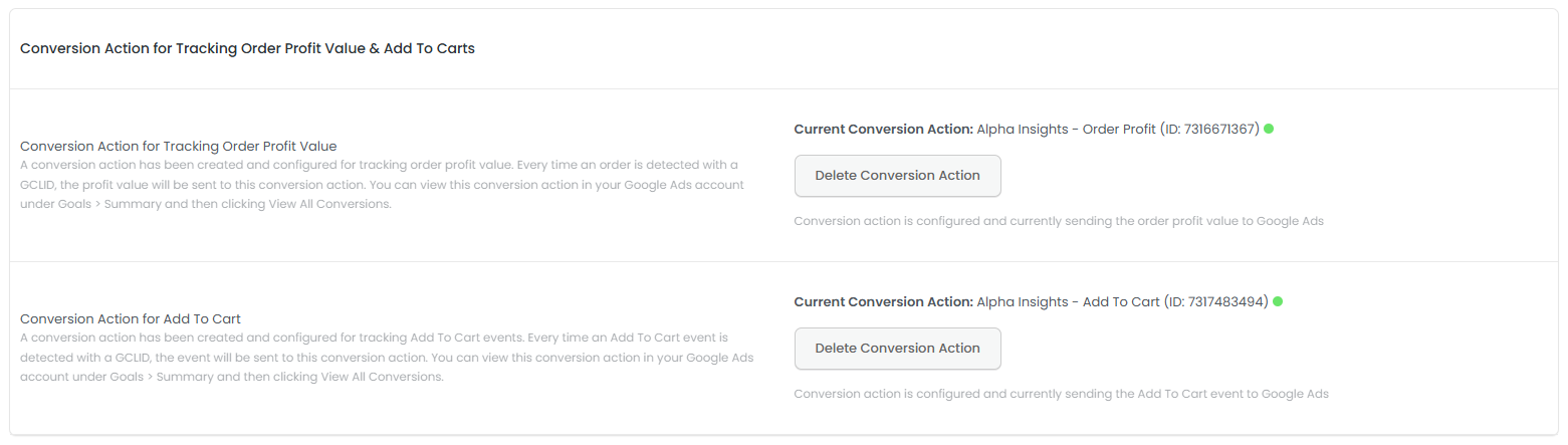 This means that we can assess the ACTUAL profitability of your Google Campaigns as we have all revenue collected, all costs & a comparison against each campaign. This will allow you to truly calculate the profitability of your campaigns. - We also include settings to create custom conversions within your Google Ad account to track Order Profit and Add To Carts. These are saved as custom conversions labelled Alpha Insights – Order Profit and Alpha Insights – Add To Cart, respectively. You can read more about that below.