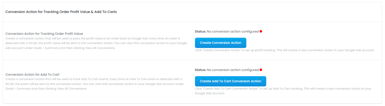 To set this up, all you need to do is click create on each of these buttons, and we will automatically create these custom conversion in your Google Ad Account (after your ad account has been configured).