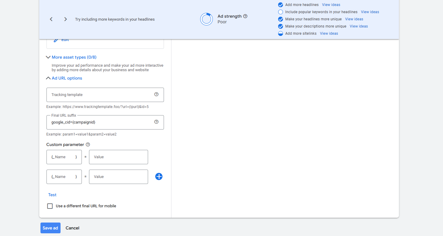 E.g. Your landing page may look like this: https://yoursite.com/products/hat/?utm_campaign=yourcampaign&utm_source=google_ppc&google_cid={campaignid}