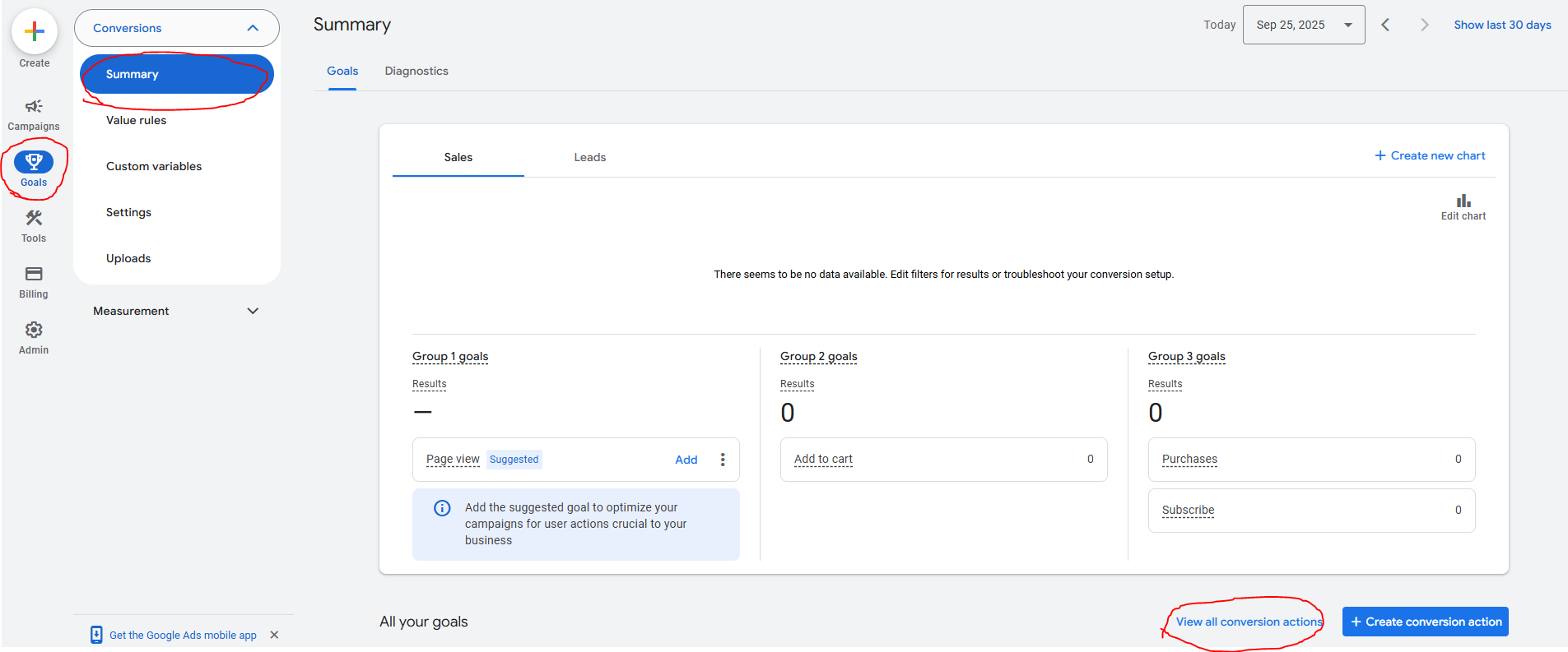 You should then be able to view these custom conversion by going to your Google Ads account and going to Goals > Summary > View All Conversion Actions.