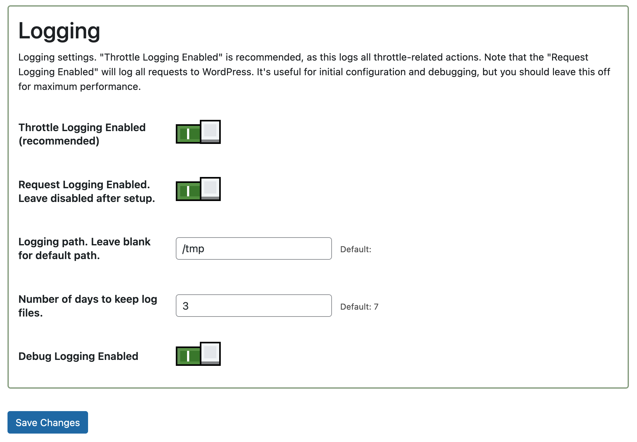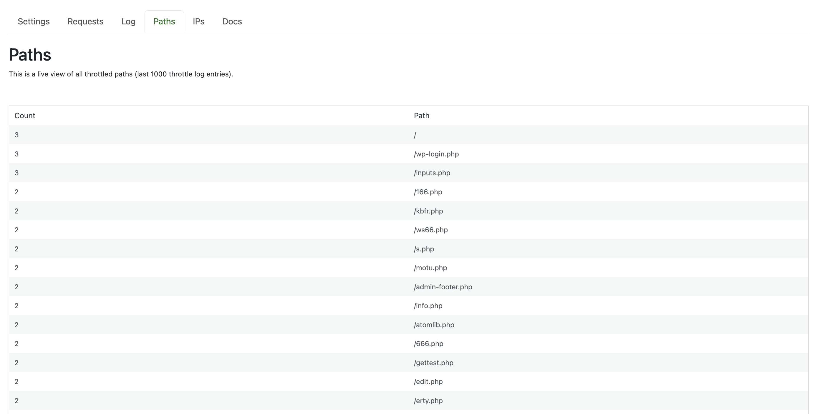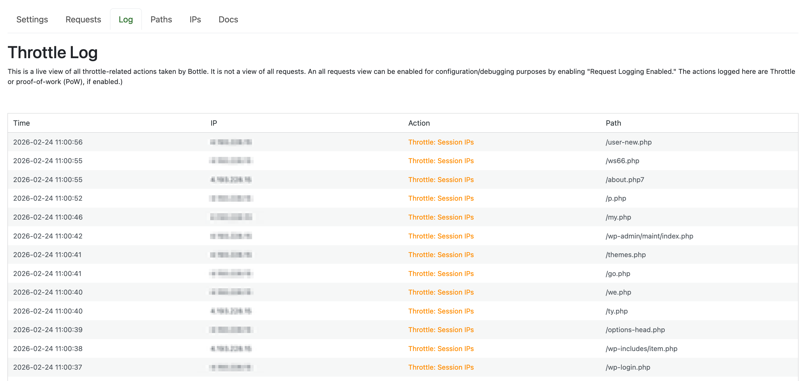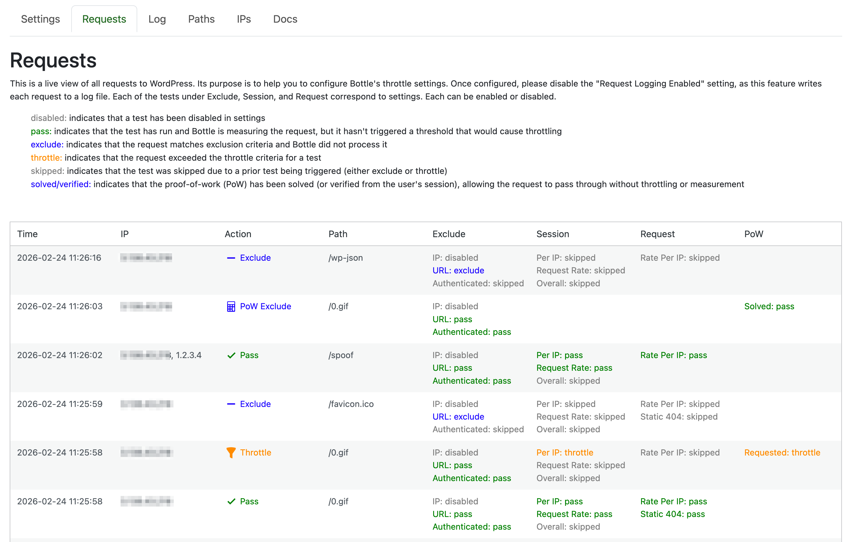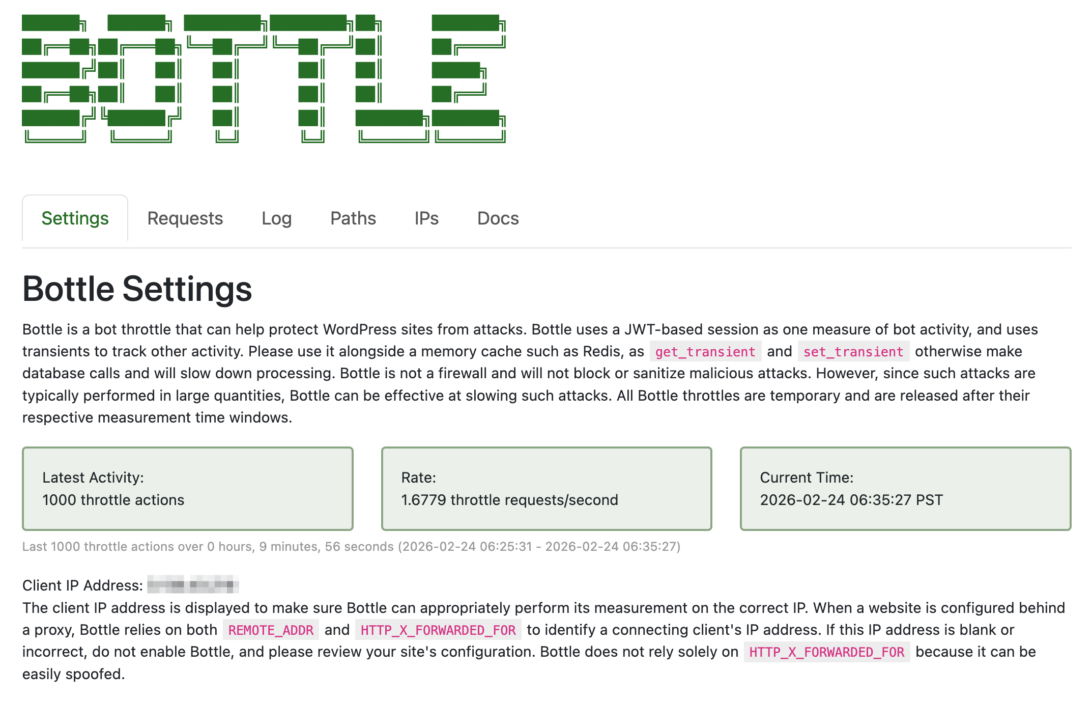 When a throttle condition is reached, Bottle terminates WordPress processing, which substantially reduces server load when under attack. Throttles end automatically at the end of their respective measurement windows.