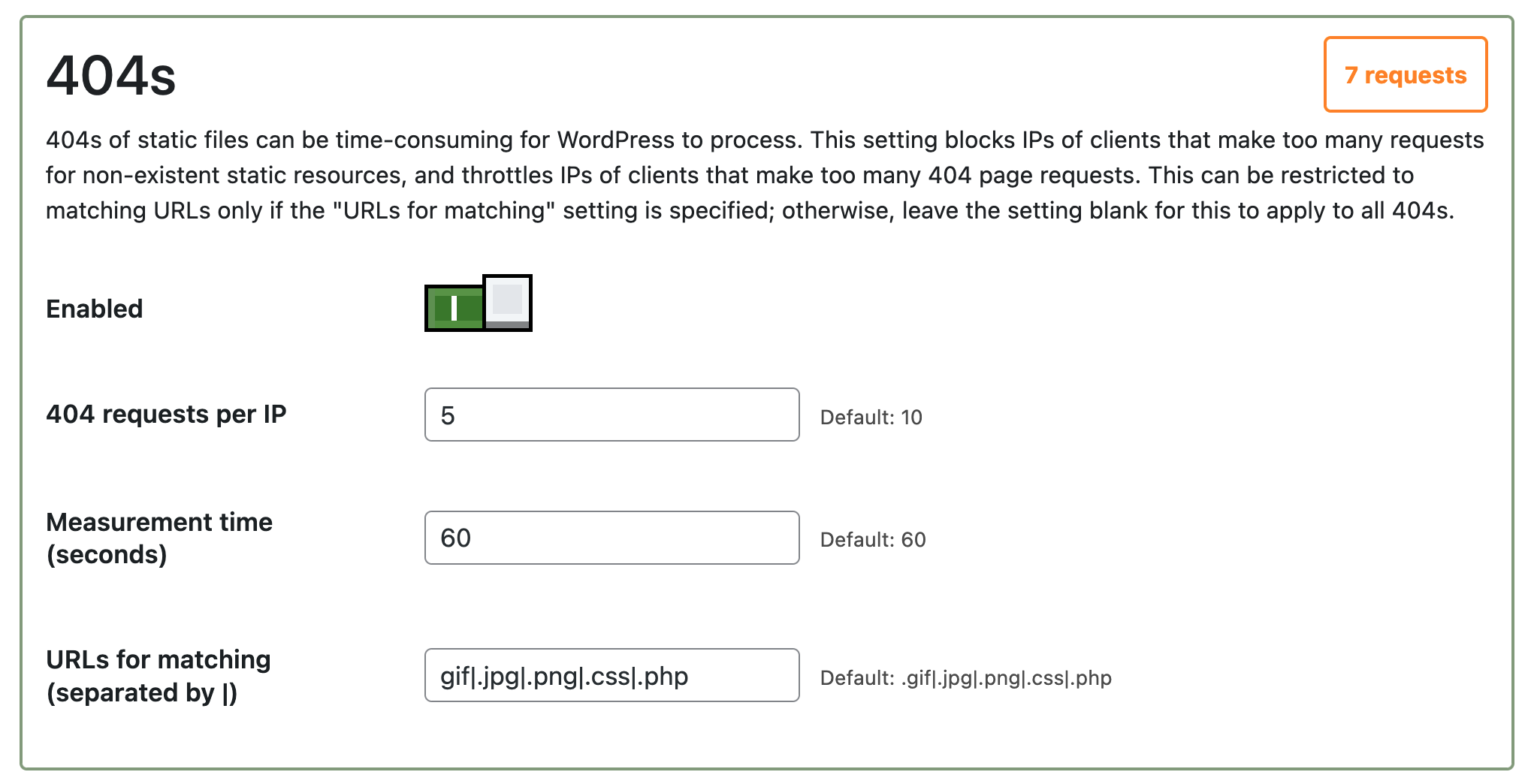 Excessive 404s. If bots are scanning a website, or are misconfigured, excessive 404s can be time-consuming for WordPress to process. Bottle can either throttle all 404 requests, or can block 404s for static files (i.e. images) only.