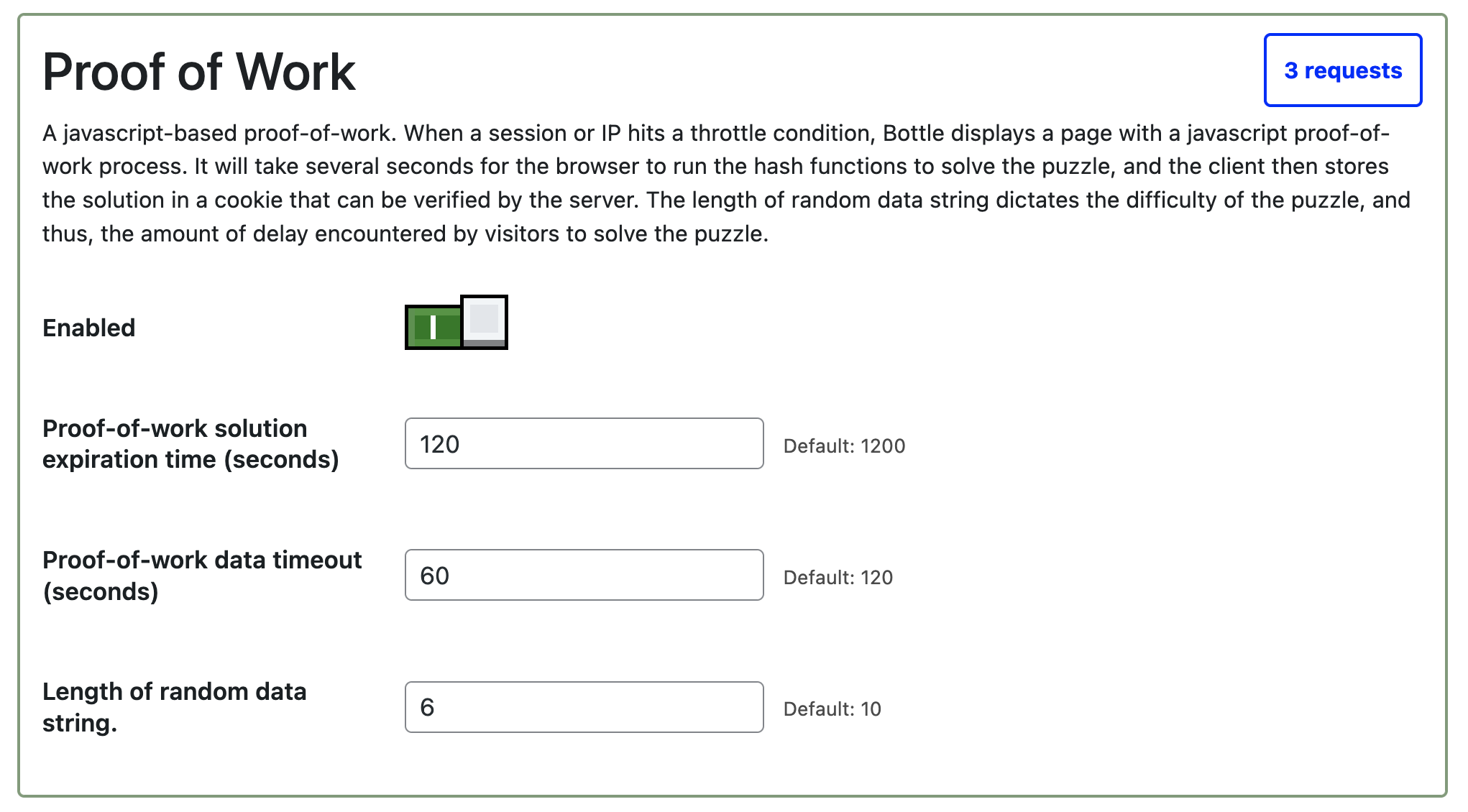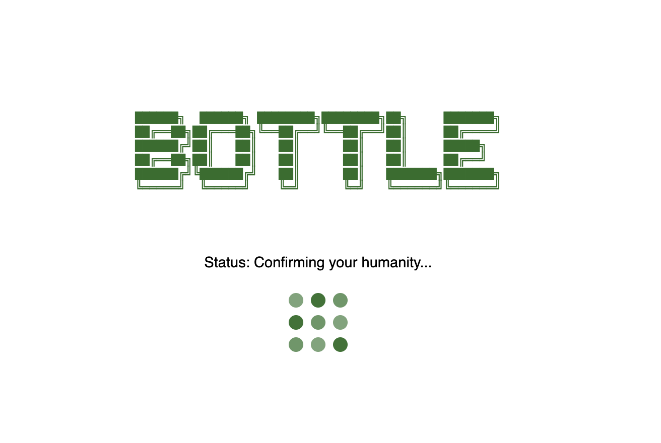 When a client is throttled, Bottle can outright throttle it with a 429 response, or can serve a JavaScript-based cryptographic puzzle. If a client is legitimate, it will automatically compute the puzzle’s solution and submit it to the server for verification. (No user input is required.) After it has proven its human-ness, Bottle will permit that user entry to the site. At the moment, some bots, but not all, will solve these puzzles.