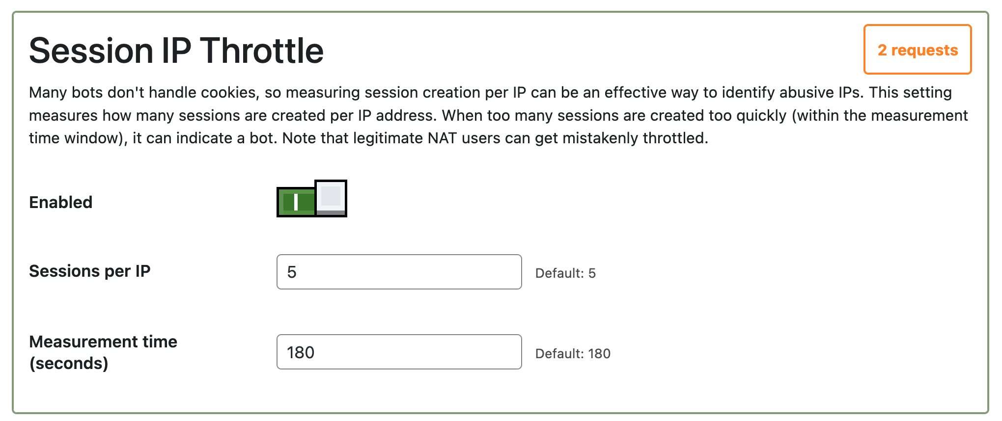 Too many sessions per IP. Since some bots don’t bother with cookies, Bottle sets a JWT session cookie for each request. If a single IP address creates too many new sessions within a given timeframe, it is likely a bot, and will be throttled.