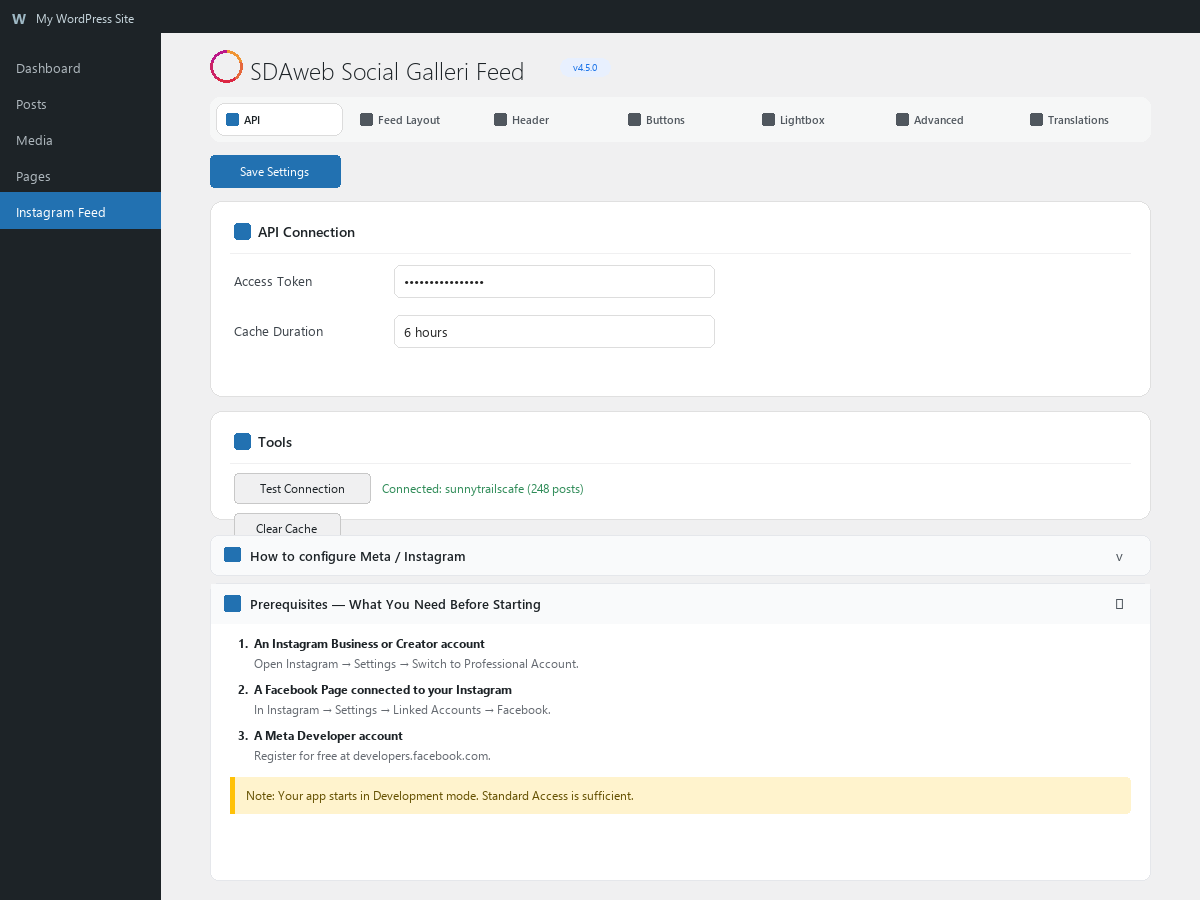 SDAweb Social Galleri Feed connects to the Instagram Graph API via a Facebook Page Access Token and displays your posts in a customizable grid gallery with lightbox. Built for speed — feeds load instantly on cached pages with zero network requests.
